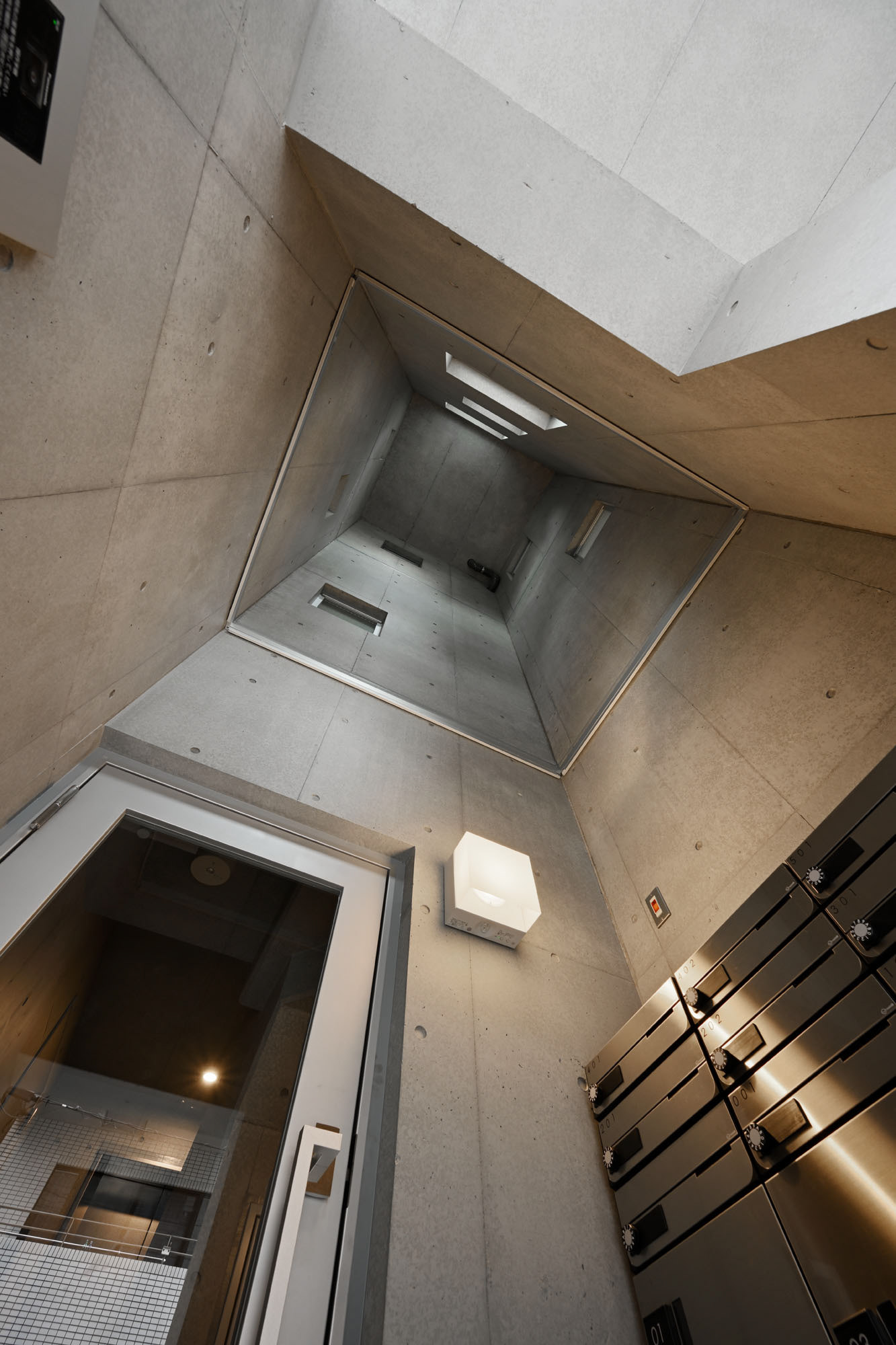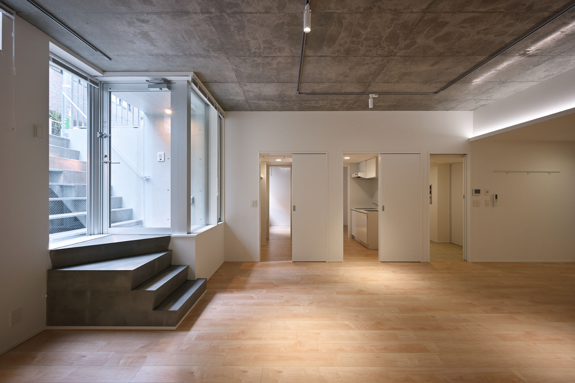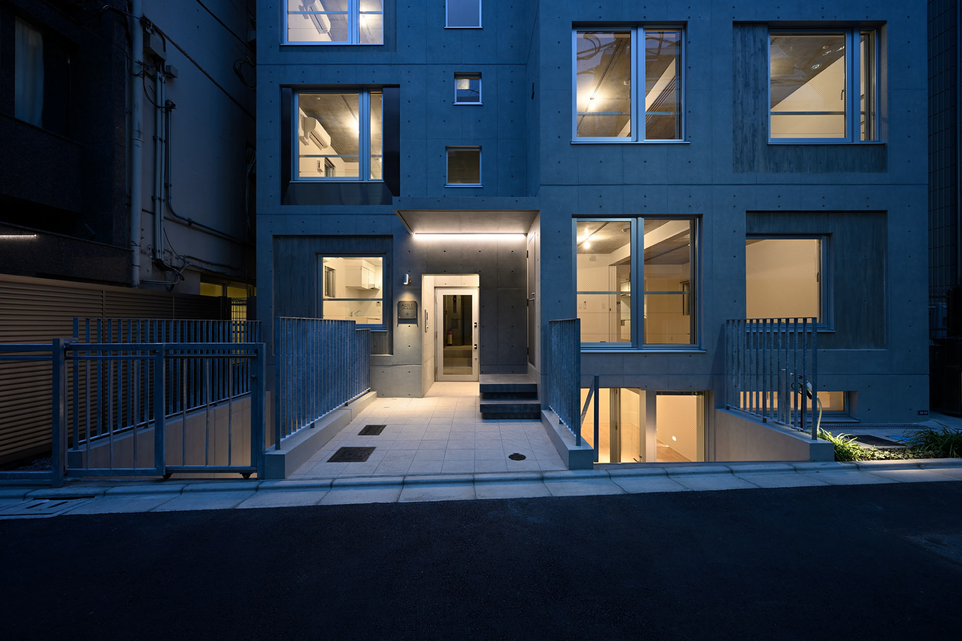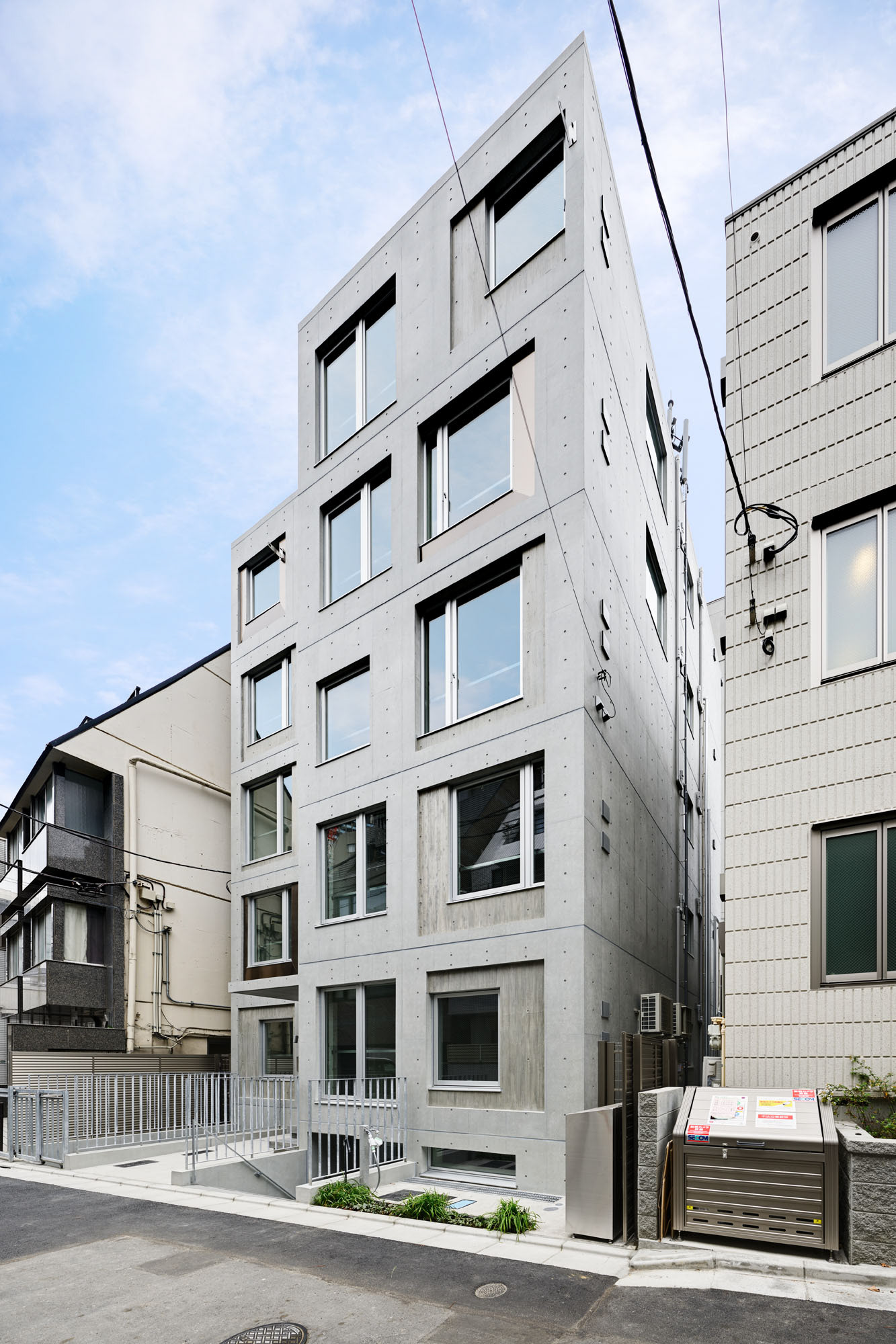 東京の新宿駅から代々木側に少し入ったところに計画した共同住宅である。起伏のある路地空間が巡り、その隙間から高層ビル群などが見えるノストラジックなエリアでもある。当計画は一連のスクエア・シリーズのひとつで、大きなフレーム、開口部など形として存在しうるものを正方形とし、使用する素材を異種混合して大きなファサードの枠組みとし、外部空間にも提示している。この計画は、地上5階、地下1階建てのRC造である。ファサードは、いくつもの正方形をつくり、その中に打放し部分、杉板型枠部分、ブロンズ色のカラーステンレス部分などで枠組みをつくった中に、開口部を設けるようにした。開口部の配置は、正方形の中でそれぞれの動きがあり、緊張する形、緩和する形もとらえられるようにバランスを取っている。エントランス空間を見上げると3層吹抜け空間があり、その吹抜け空間に各住戸の開口部がそれぞれ顔を出している。居住者や来訪者の気配をお互いに感じることが出来るような構成としている。共同住宅の構成は、地上部分は、ワンルームと1LDKの各階2住戸づつとしている。ワンルームの中には自立壁の構成で天井空間は開放するようしたWICを設けるようにしている。20㎡もないタイプで少しでも居住空間を広げる試みである。1LDKは、ベッドルームを4枚引戸とし、リビングルームと開放して利用出来るようにして自由度が高く大きな開口部に面して明るく開放的な空間とした。地下は、南北にドライエリアを設け光がはいる居住空間とし、センターのコア(キッチン、収納部屋)を介して、就寝ゾーンとリビングゾーンを明確に区分けし、SOHOのような外部の人も出入りするのに適した構成としている。