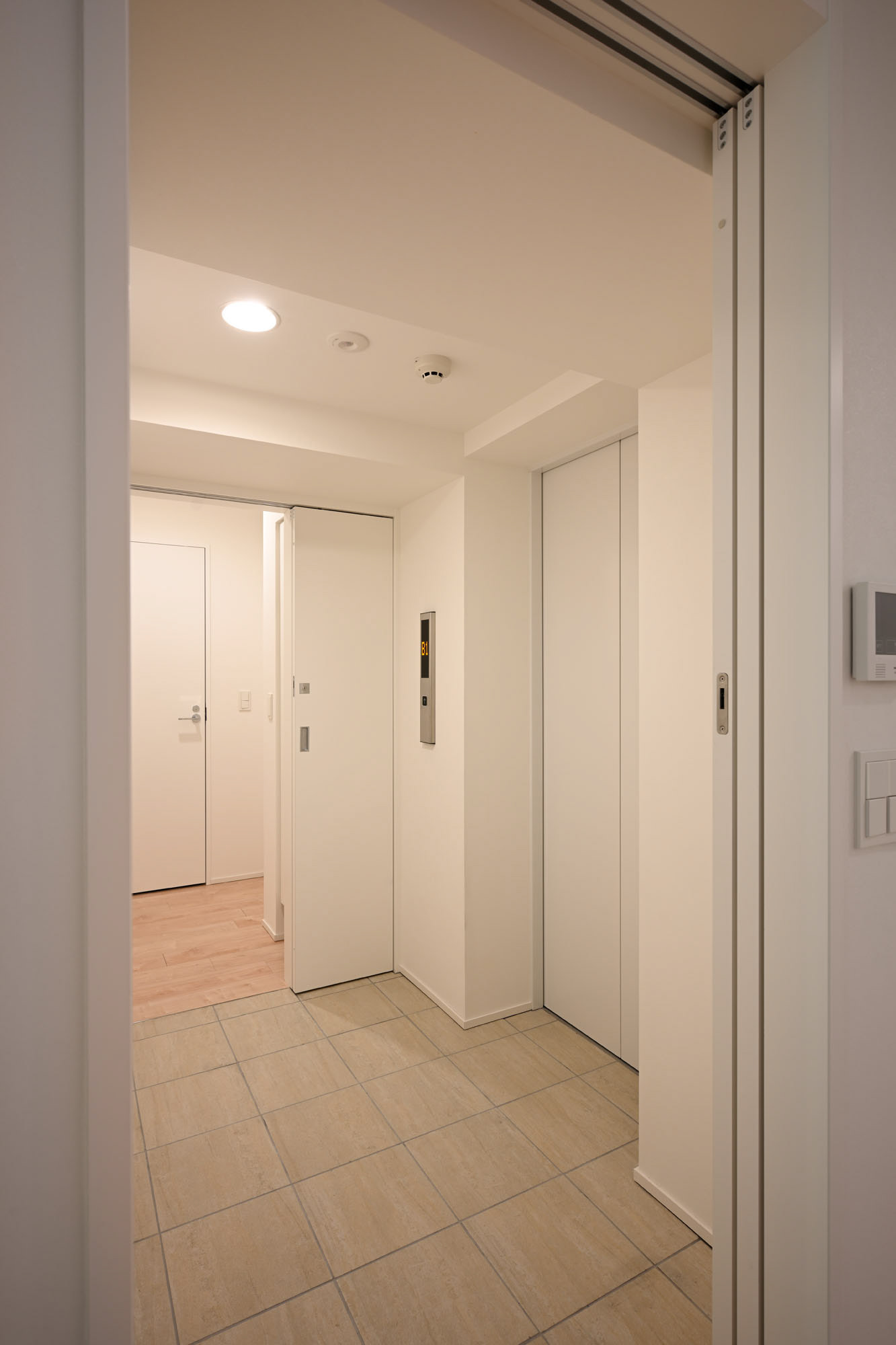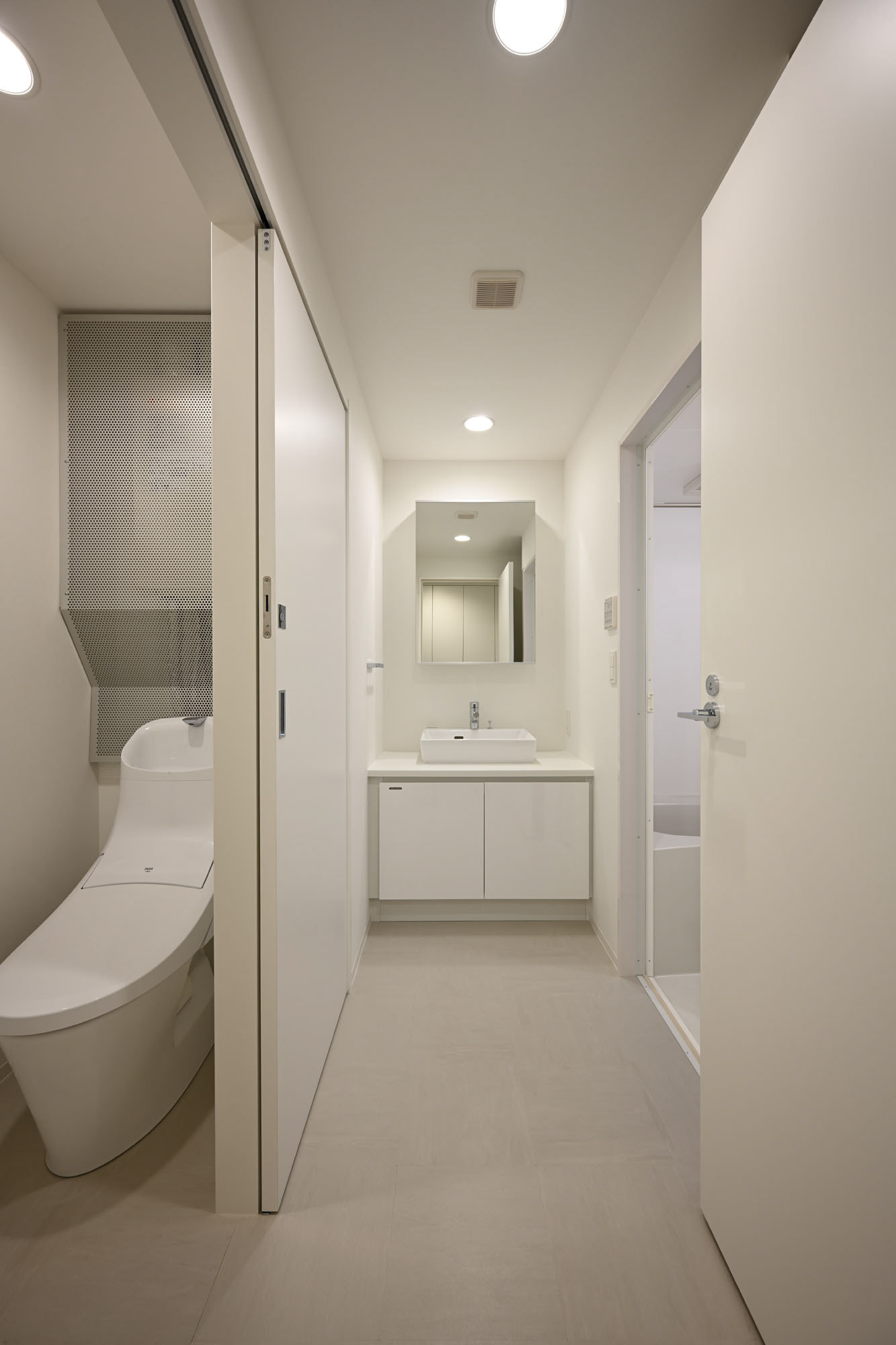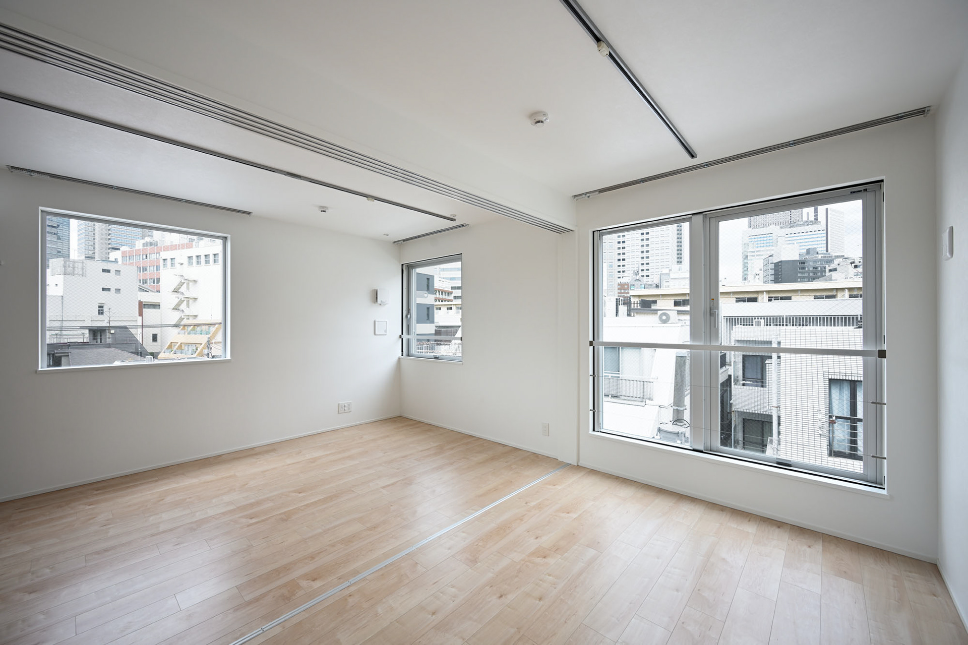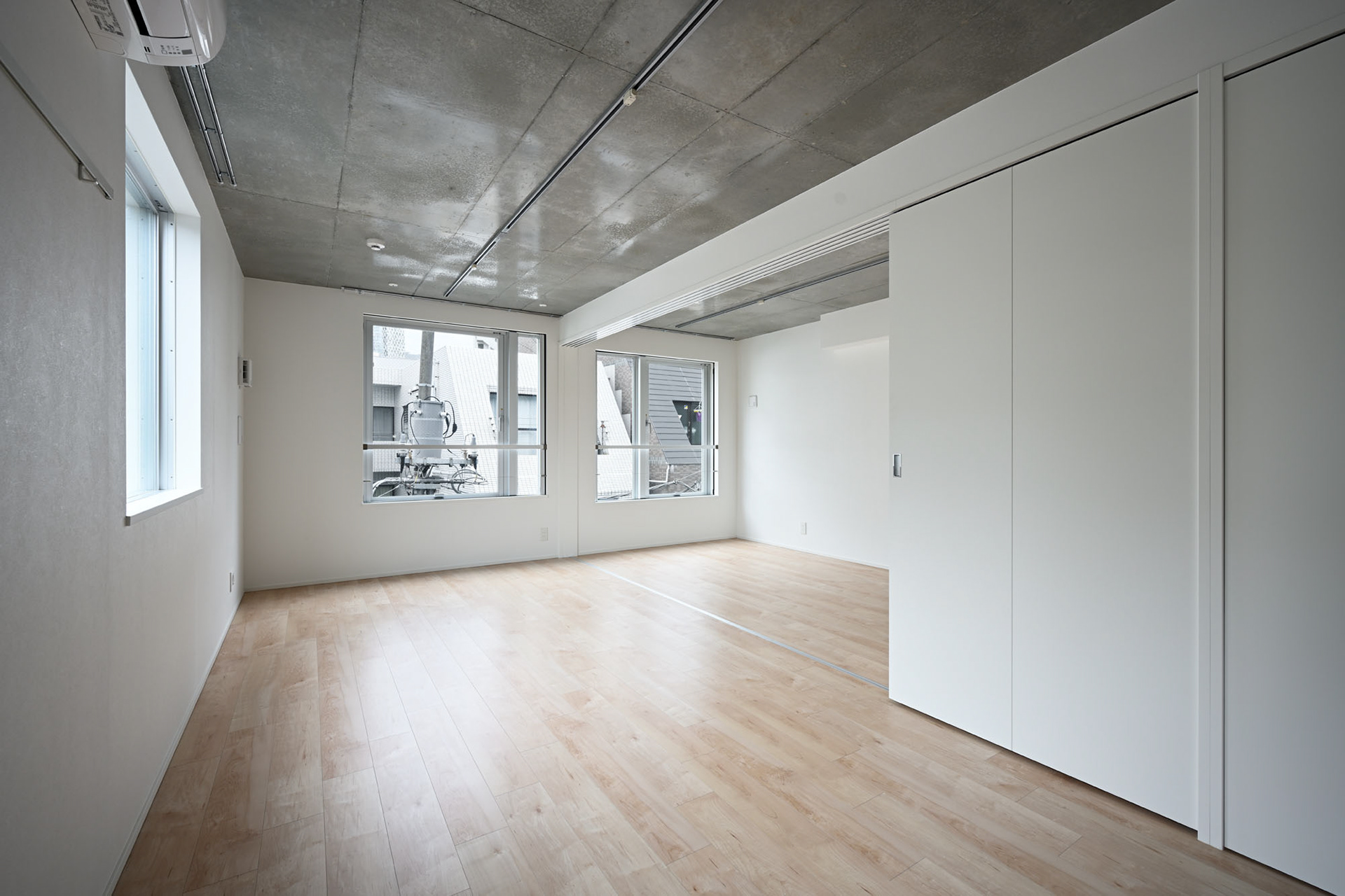 東京の新宿駅から代々木側に少し入ったところに計画した共同住宅である。起伏のある路地空間が巡り、その隙間から高層ビル群などが見えるノストラジックなエリアでもある。当計画は一連のスクエア・シリーズのひとつで、大きなフレーム、開口部など形として存在しうるものを正方形とし、使用する素材を異種混合して大きなファサードの枠組みとし、外部空間にも提示している。この計画は、地上5階、地下1階建てのRC造である。ファサードは、いくつもの正方形をつくり、その中に打放し部分、杉板型枠部分、ブロンズ色のカラーステンレス部分などで枠組みをつくった中に、開口部を設けるようにした。開口部の配置は、正方形の中でそれぞれの動きがあり、緊張する形、緩和する形もとらえられるようにバランスを取っている。エントランス空間を見上げると3層吹抜け空間があり、その吹抜け空間に各住戸の開口部がそれぞれ顔を出している。居住者や来訪者の気配をお互いに感じることが出来るような構成としている。共同住宅の構成は、地上部分は、ワンルームと1LDKの各階2住戸づつとしている。ワンルームの中には自立壁の構成で天井空間は開放するようしたWICを設けるようにしている。20㎡もないタイプで少しでも居住空間を広げる試みである。1LDKは、ベッドルームを4枚引戸とし、リビングルームと開放して利用出来るようにして自由度が高く大きな開口部に面して明るく開放的な空間とした。地下は、南北にドライエリアを設け光がはいる居住空間とし、センターのコア(キッチン、収納部屋)を介して、就寝ゾーンとリビングゾーンを明確に区分けし、SOHOのような外部の人も出入りするのに適した構成としている。