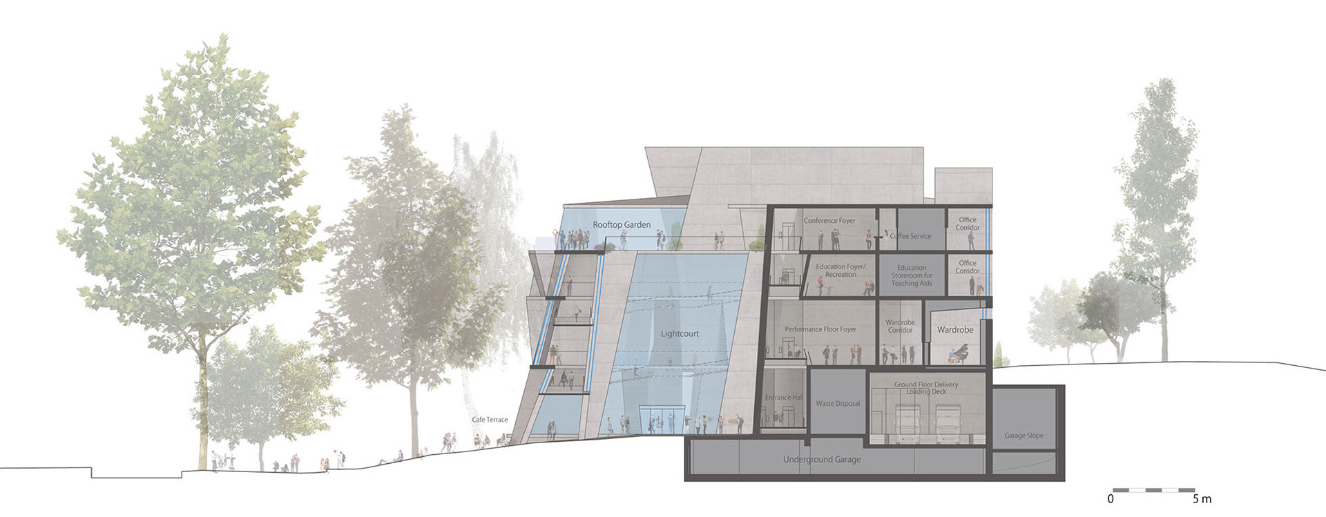 コンセプトは、東西軸に沿ってメインエントランスを開くことで、オブジェクトと環境の明確なつながりを想定しています。この軸は、東側のエントランスゾーンとメインコート、そしてコンサートホールのホワイエを結んでいます。ホワイエには大きなガラス窓があり、公園を遮るものなく見渡すことができるため、すべてのフロアでゲストと自然と常に触れ合わせることができます。ホワイエからカフェ、MCM前の広場に至るまで、内と外を自由に行き来できるよう、南北の軸線上にもつながりを持たせました。