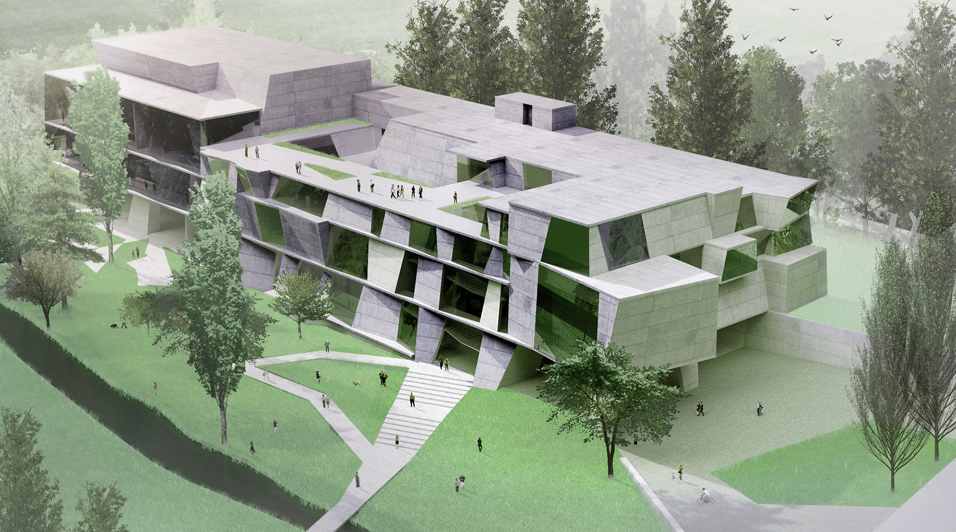 The International Music Centre has been planned to be in the vicinity of the park near the birthplace of Fryderyk Chopin. As a conscious effort to integrate the building into its surrounding environment, it was aimed to serve the Żelazowa Wola as a part of the monument in honour of the composer, linking the interior of the MCM to the natural environment and on a larger scale to the Krzywada-Porkowskiego park: providing visitors with free access to all the musical facilities and to provide the investors with freedom in the composition of their work and personal life.