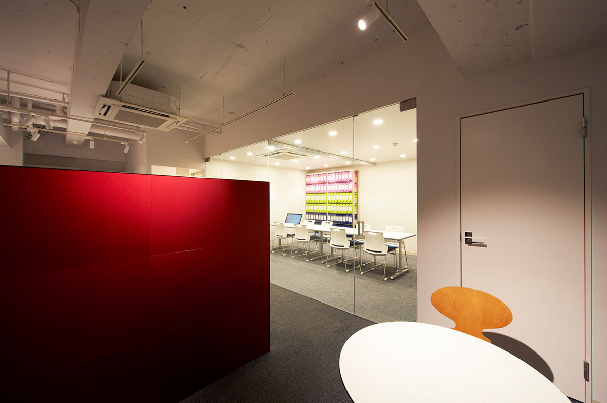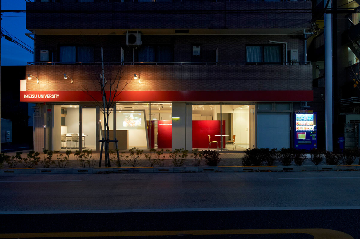 Tucked away around the corner of the main entrance of the university campus, Admission Center of Kaetsu University is Sasaki Architecture’s recent renovation project of a storefront retail space facing a busy street in a Tokyo suburb. Folded surfaces that demarcate an administrative office, two meeting rooms, reception, and a small lounge can be viewed from the street through its glass façade in rectangles and trapezoids. Understated monotone colors were chosen for the ceiling, floor, and walls to accentuate the aluminum panels in crimson red, the school color, which demarcate the interior boundary between the private and the public. The center trapezoid frame, which houses the reception area, also features a video screen that engages the gaze of the passer-bys with the design at night.