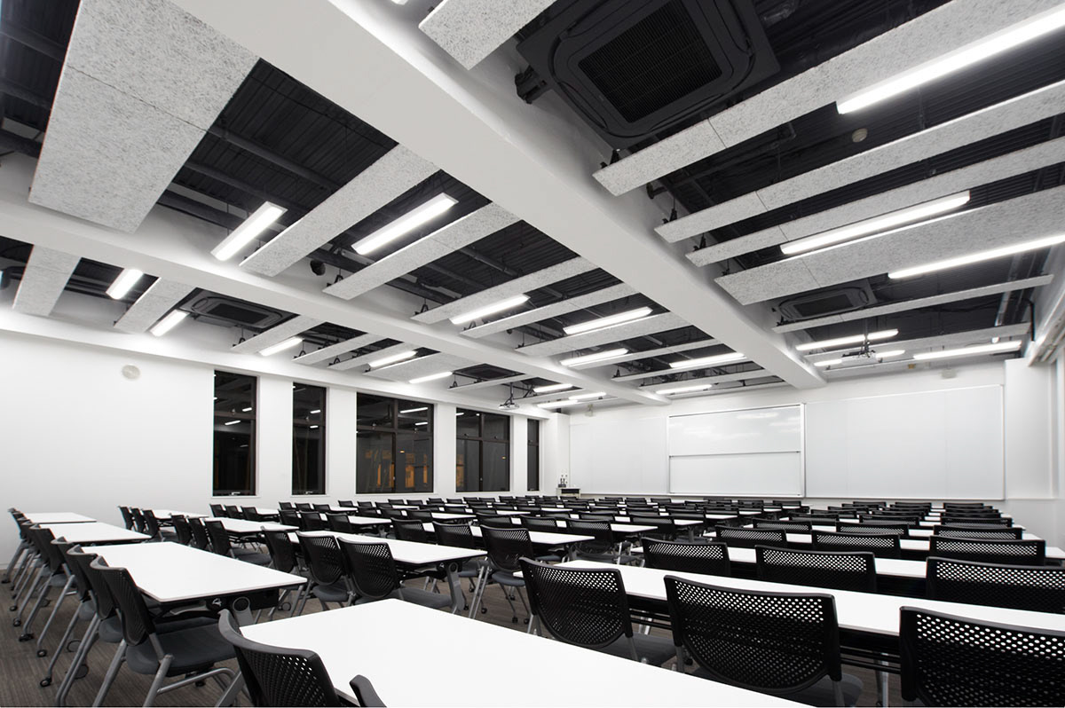 秘書科の社長室マナー教室として使用されていた教室は、時代のニーズから外れてきて新しい教室として生まれ変わる事になった。天井は取り払われ、天井高さを確保しつつ吸音効果も担っている木毛セメント板でつくられたフラットルーバー天井と照明によりリズムをつくっている。天井から開口面まで包容される空間は新たな教室空間として存在する。