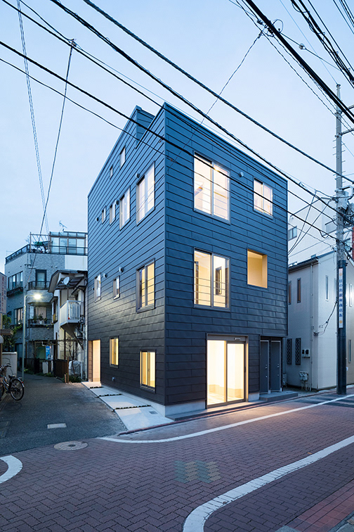 The project is a small-scaled three-storey wooden framed structure, sheathed in darkly matted metal siding — part of the Kojiya community, a friendly town in the south of Tokyo. In this slow but lively town space, filled with sea breezes rushing in, one may easily forget that this segment of land is part of one of the world's largest megalopolises. Bustling with visitors and shoppers during the day, but also gently lit in calmness during the evening — it is a place where careful consideration is essential of the history and community character when building. The Nanatsuji intersection, the symbol of the town, is famous for its seven roads which join at one point without a traffic signal. It may seem chaotic, fraught with the possibility of collision, however, there has not been an accident on this intersection since its first appearance in 1917. The local drivers letting each other pass before driving themselves have earned a reputation of being known as “the politest intersection in Japan.” This kind of humbleness towards others is the virtue of the Japanese local community that has been maintained even under the most extreme conditions — some of which may include earthquakes, bombings, mass urbanization, and airport expansion.The project faces one of these seven roads — not far from the intersection itself, which is visible from the very doorstep of the building. The first floor is reserved for a small real estate office, with two apartments above. The overall volume of the building was determined by the site conditions. Instead of creating a strong division between the building and its environment, the project has aspired to maintain a connection with the modest and warm-hearted town.Each of the building’s floors face the street with a unique indoor and outdoor space, having a softening effect on the bustling town below. During the day, the office on the first floor opens widely to the shopping lane — welcoming the passing pedestrians. Whereas the residential units above feature small sunrooms, similar to the concept of a winter garden, adding sunlit luxury to the otherwise dark living spaces — while also freeing one from the idea of using air conditioning during summer, a sustainable and environmentally friendly way of living. Together these elements engage the community with an appropriate level of privacy and public inclusion.The seven windows across the facade on the west side of the building’s residential unit — each with a different function, size, and position — start from the corners and loosely ascend skywards, reflecting the conceptual idea of the Nanatsuji intersection. By bearing the symbol of the local people's considerate ways of living, the quiet respect to the local community is extended further through the building’s design. With the least amount of disturbances, the small building takes up residence in this humble yet richly historic community.