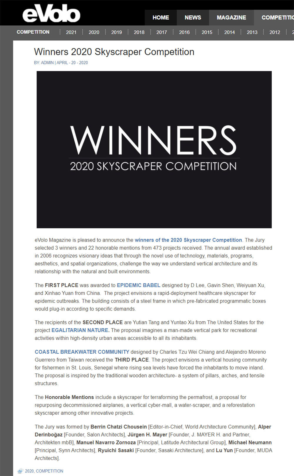 Ryuichi Sasaki is attending as Jury for Evolo Skyscraper Competition 2020. (USA)