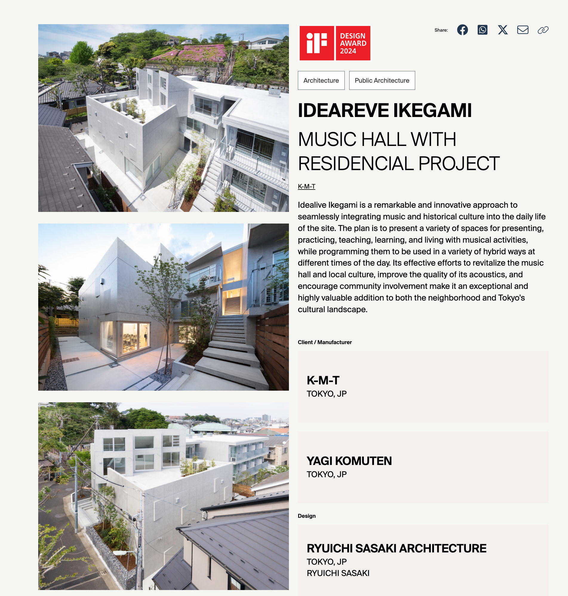 「池上の音楽複合プロジェクト」(建物名称 IDEAREVE IKEGAMI)がドイツの「IF賞」のWINNER受賞を頂きました。