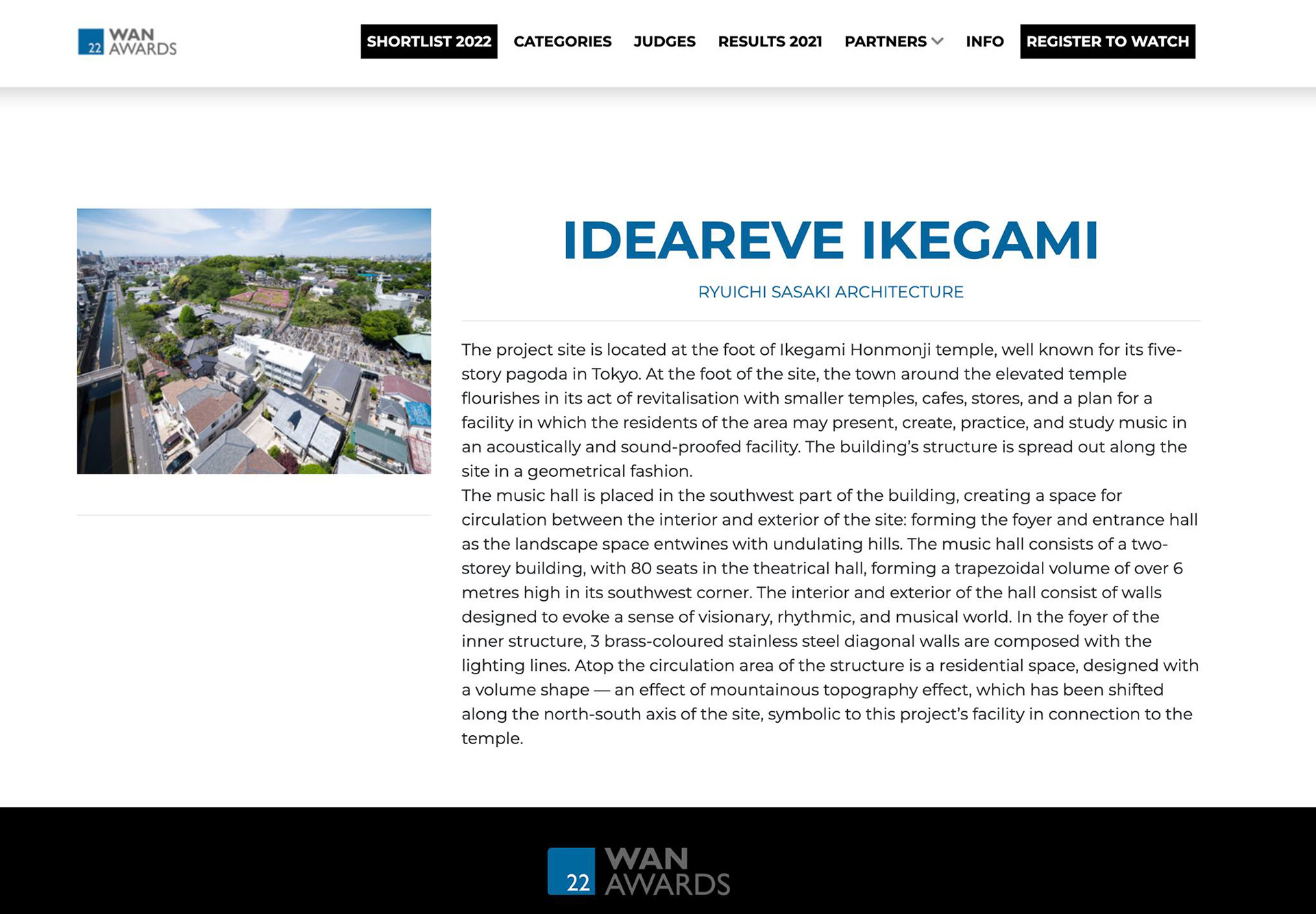 WAN (WORLD ARCHITECTURE NEWS) AWARDS 2022(イギリス、ロンドン)で池上の音楽複合プロジェクト(建物名称 IDEAREVE IKEGAMI)がMIX USED (複合)部門にてショートリストに入りました。(主催 WORLD ARCHITECTURE NEWS)