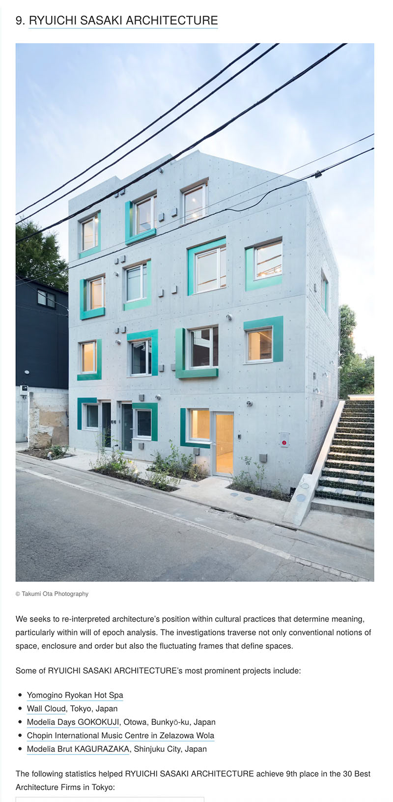 「30 Best Architecture and Design Firms in Tokyo(東京の建築設計事務所ベスト30)」について