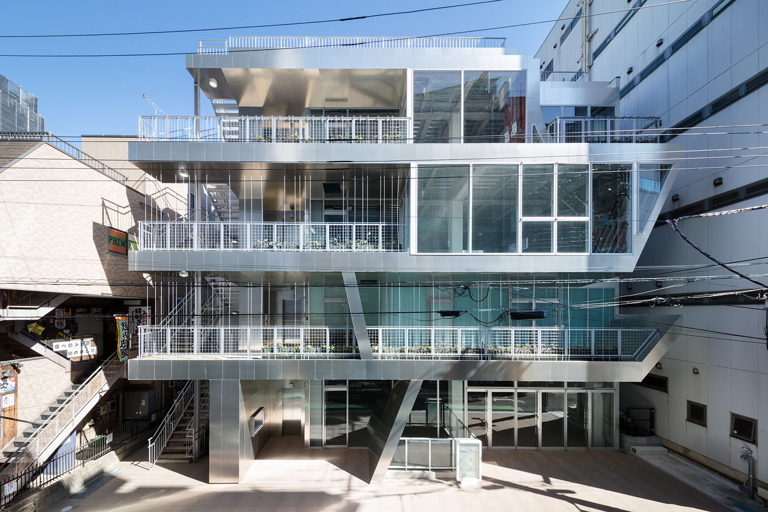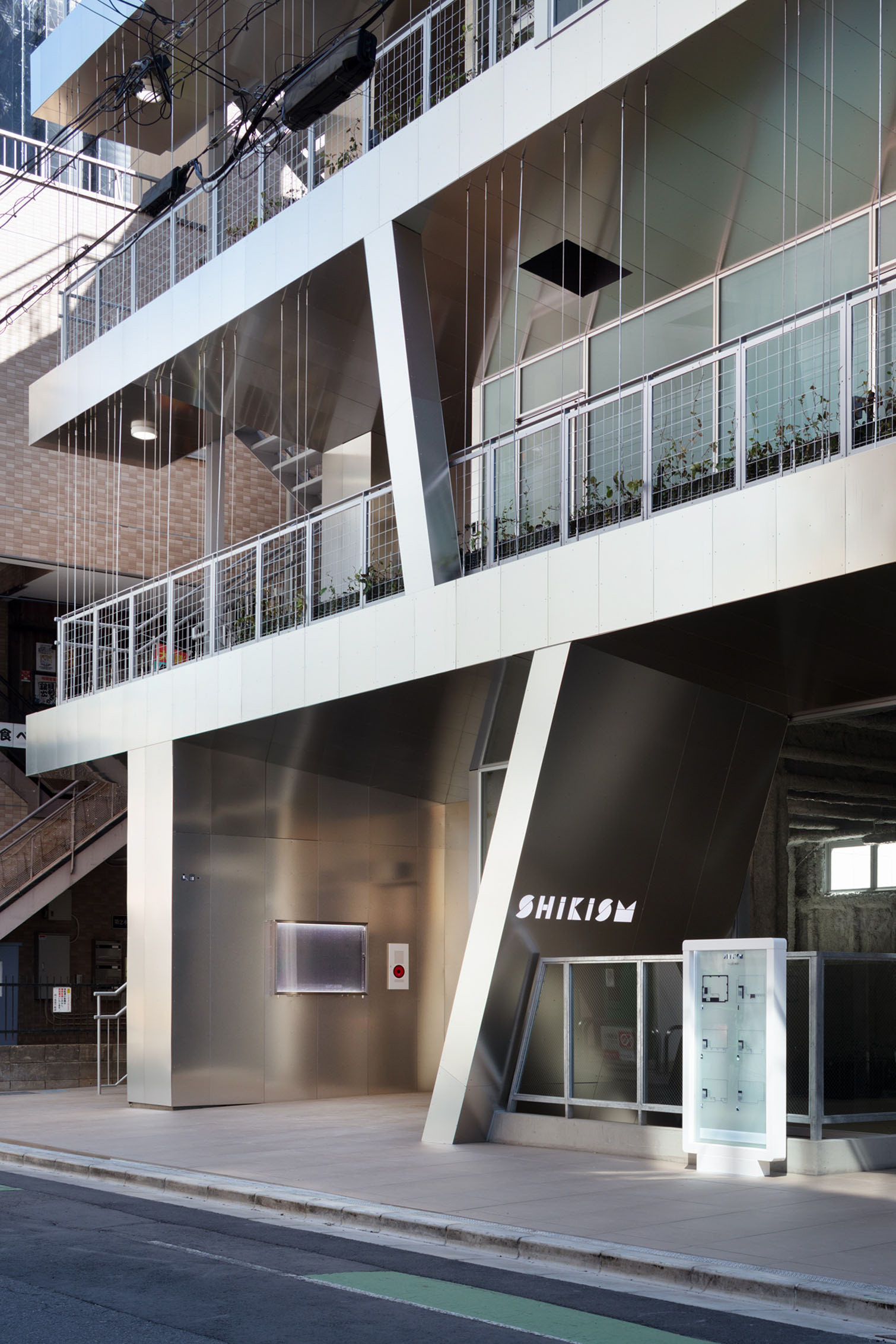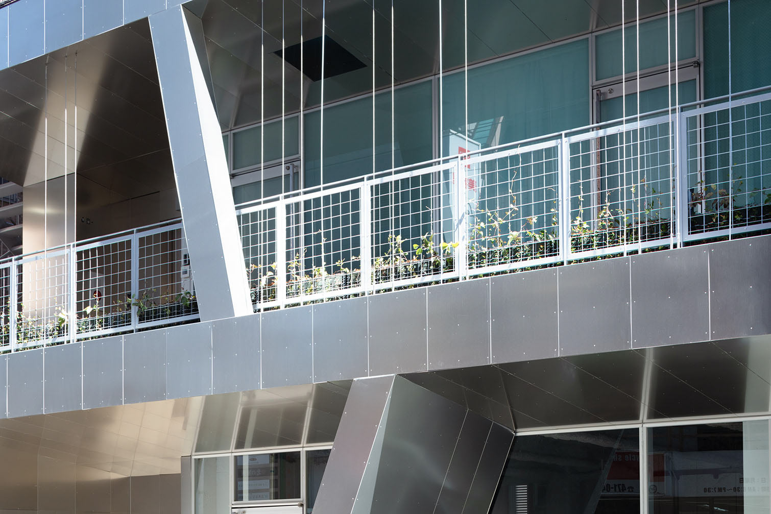 With a façade of reflective colored-aluminum cladding, the building is integrated into the shopping street leading to Shiki Station, serving as the starting point for a new era for the district. The size and shape of the three front terraces differ on each floor, bringing variety to the façade. In some places they are missing part of the ceiling or floor, while in others the floor tilts up into a wall that connects with the floor above it. The terrace surface is made of the same colored aluminum as the façade and reflects the movements of people inside and outside the building. Vines climb the wires and rods stretched between the upper and lower balcony slabs. The façade is envisioned as an iconic new architectural form, giving rise to interactions between the building and the colored aluminum.