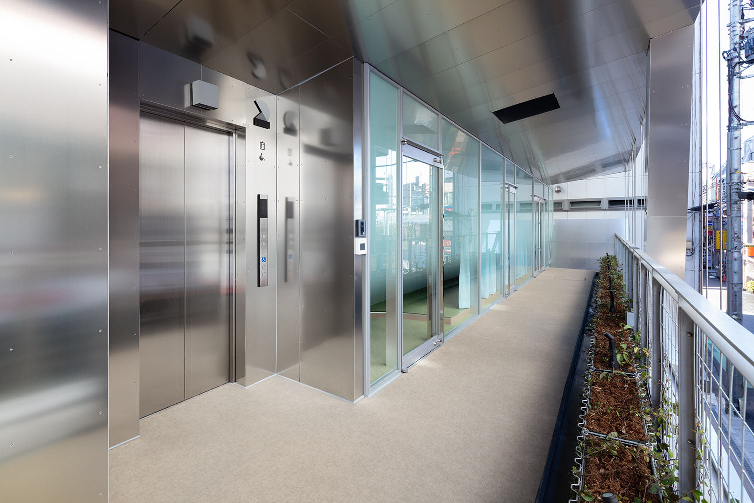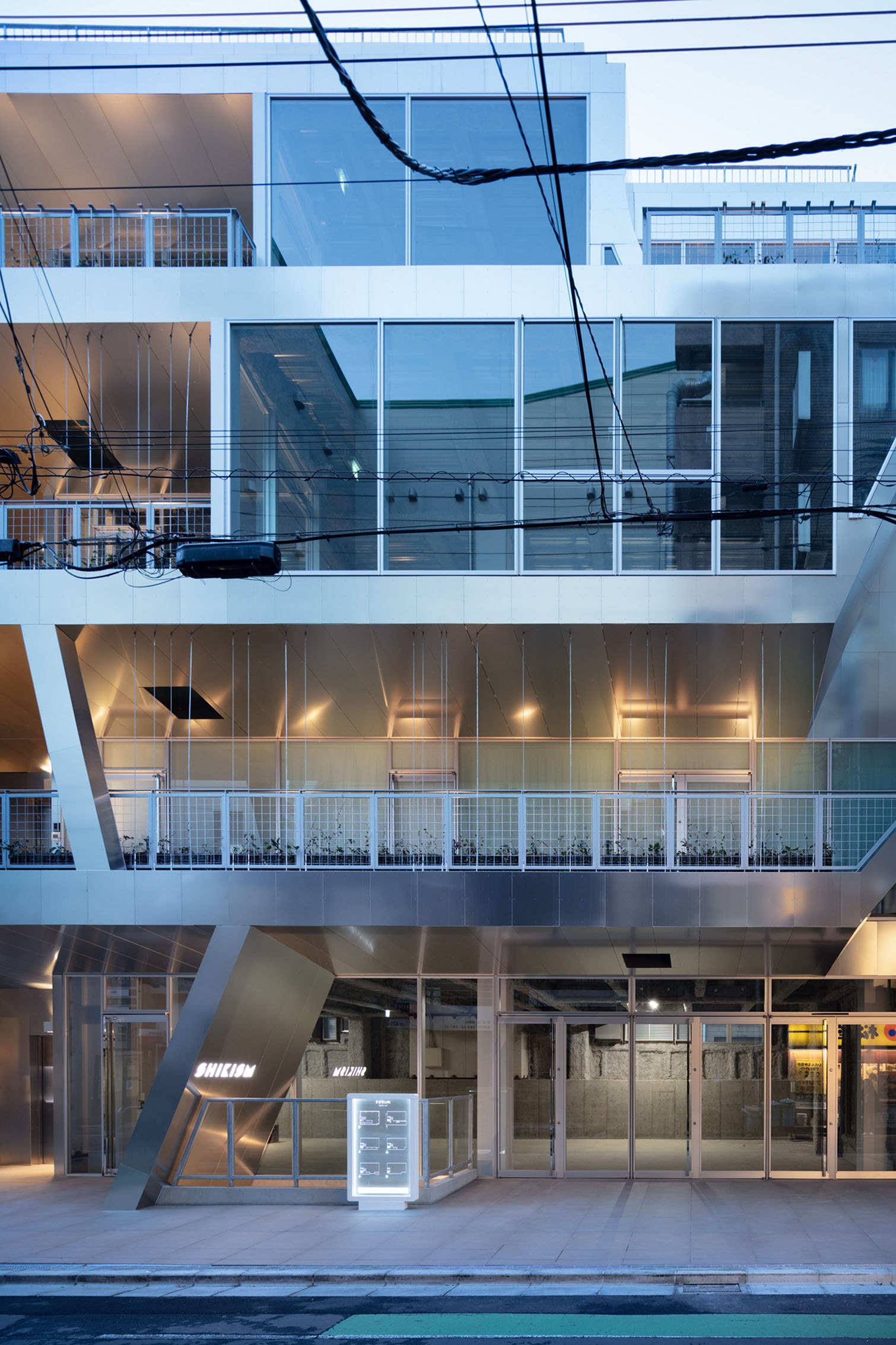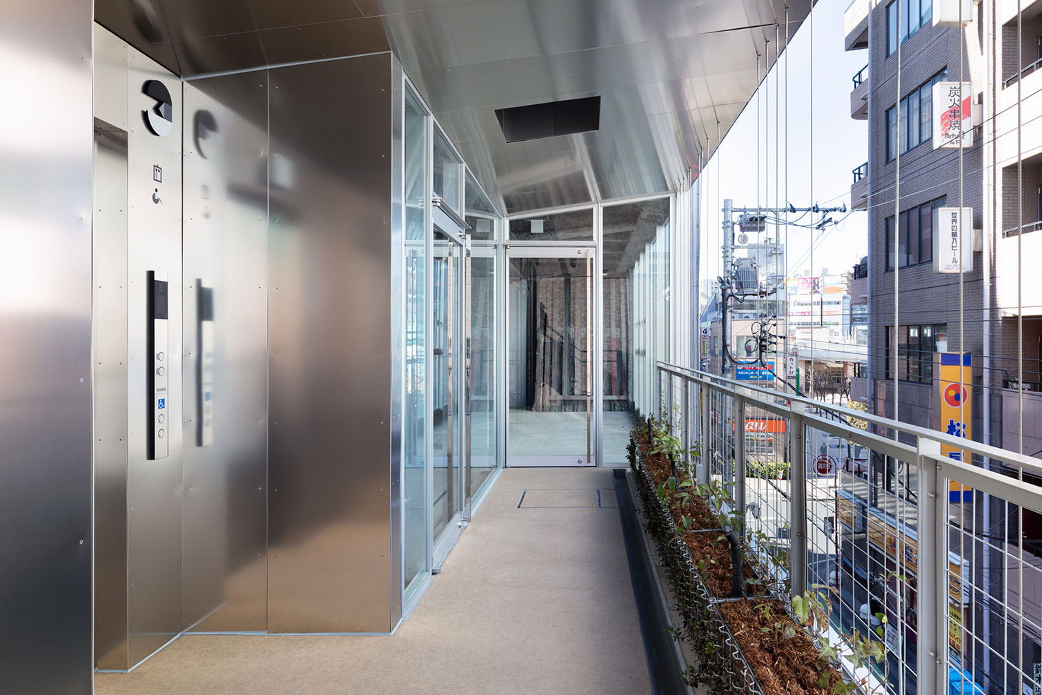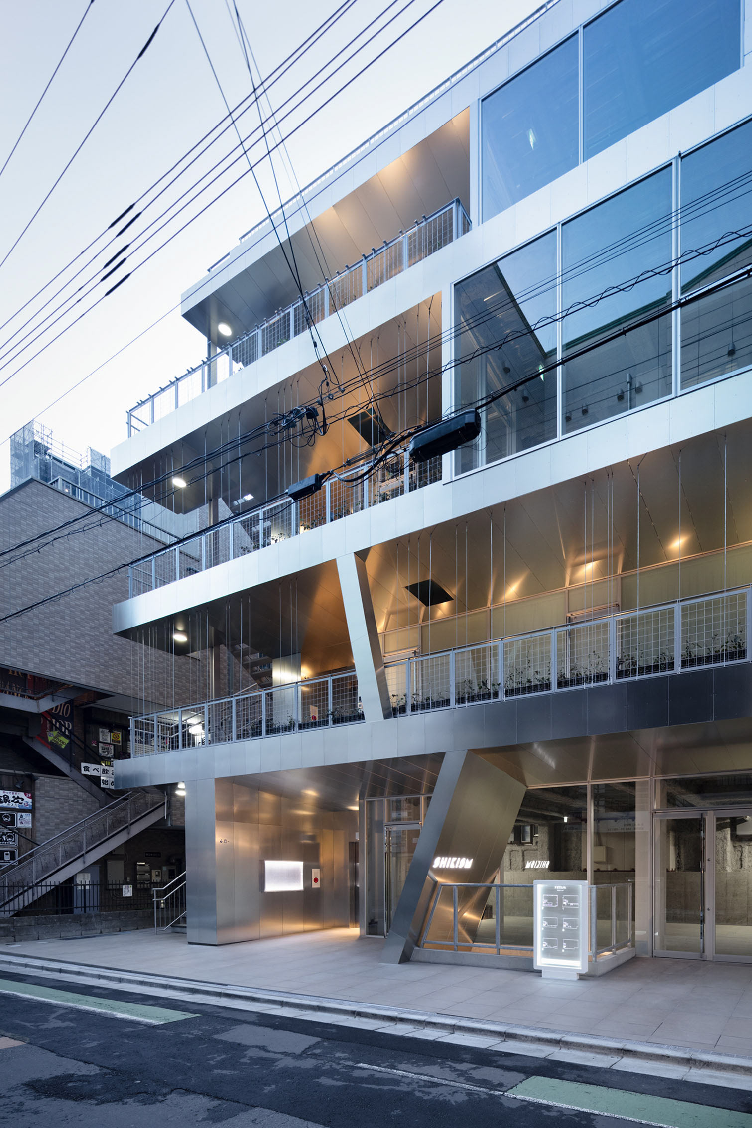 With a façade of reflective colored-aluminum cladding, the building is integrated into the shopping street leading to Shiki Station, serving as the starting point for a new era for the district. The size and shape of the three front terraces differ on each floor, bringing variety to the façade. In some places they are missing part of the ceiling or floor, while in others the floor tilts up into a wall that connects with the floor above it. The terrace surface is made of the same colored aluminum as the façade and reflects the movements of people inside and outside the building. Vines climb the wires and rods stretched between the upper and lower balcony slabs. The façade is envisioned as an iconic new architectural form, giving rise to interactions between the building and the colored aluminum.