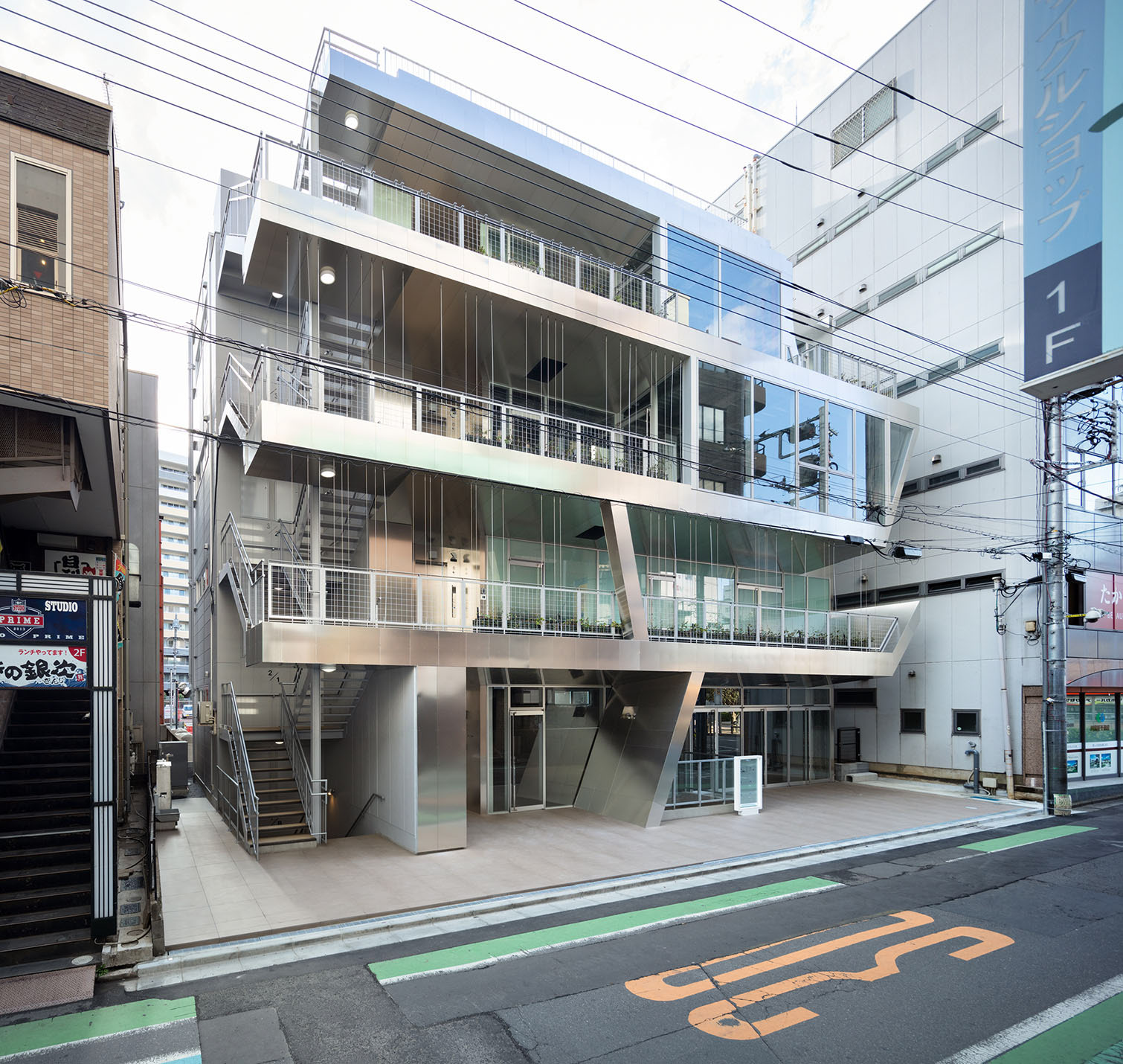 Located on a commercial street about thirty minutes by train from the center of Tokyo, within walking distance from Shiki Station in Saitama Prefecture, this steel-frame multi-tenant building has four stories above ground and one below. The city of Shiki prospered as a commercial area on the banks of the Shingashi River during the Edo period, and in modern times developed as a major stop on the Tobu-Tojo railway line.