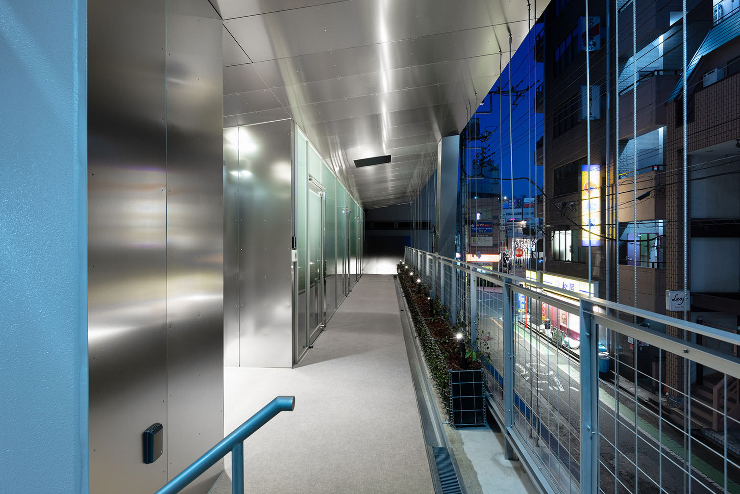 建物のファサードは、建物全体としてカラーアルミ光輝材を包み込み、志木駅へ繋がる商店街に挿入している。商店街の部分として新たな時代の起点のきっかけとなるように街全体へ繋がっている。