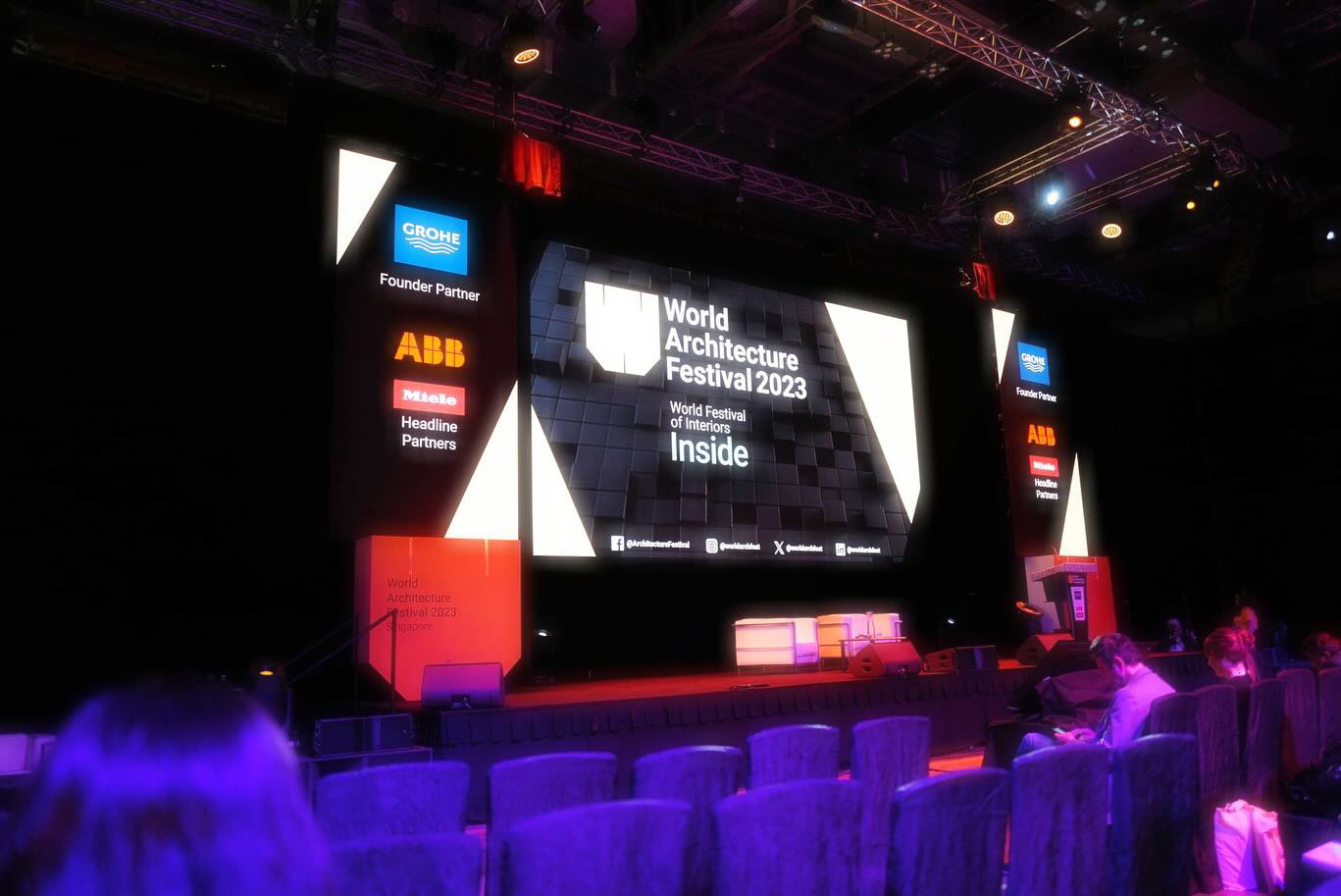 2023年のWAFはシンガポールです。前夜祭はマリナ・ベイ・サンズのART SCIENCE MUSEUMでありました。WAF初日の午後のプレゼンテーションでした。集合住宅部門の「CUADRO NAKANO NORTH」。会場のスタイルは例年と同様です。ユニットはそれぞれ大きなテントの中でプレゼンテーションする人と審査員と客席があります。